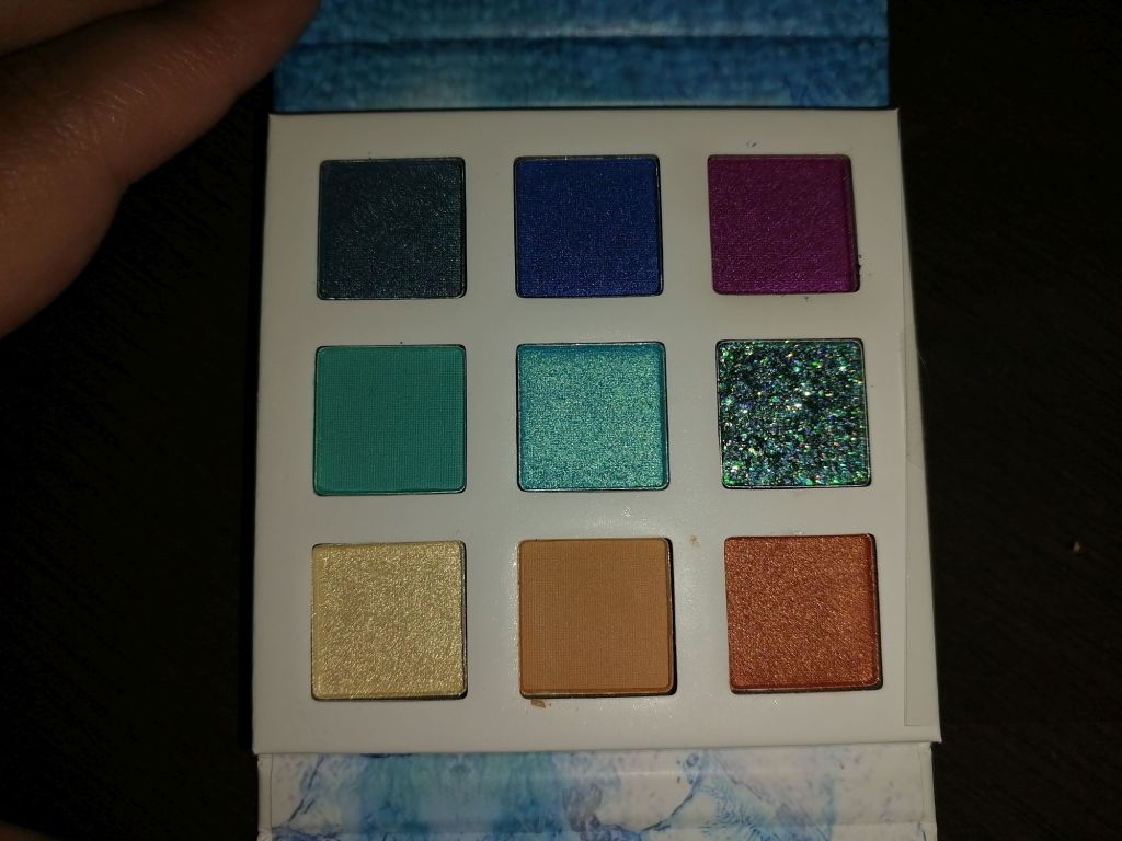 The shades have no name, so I’m going to show them to like they are arranged in the palette, starting from the top row, from left to right. So we have a marine blue with shimmery finish, a royal blue with shimmery finish, a violet with shimmery finish, a marine green with matte finish, a turquoise with shimmery finish, a light blue pressed glitter, a gold with shimmery finish, a light brown with matte finish and an orange brown with shimmery finish.