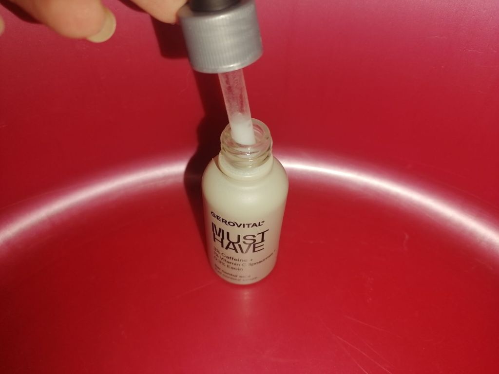 The packaging is exactly the same like the one from the face serum, a cream glass bottle with a dropper that contains 30 ml. This eye serum also costs around 6.5 euros.