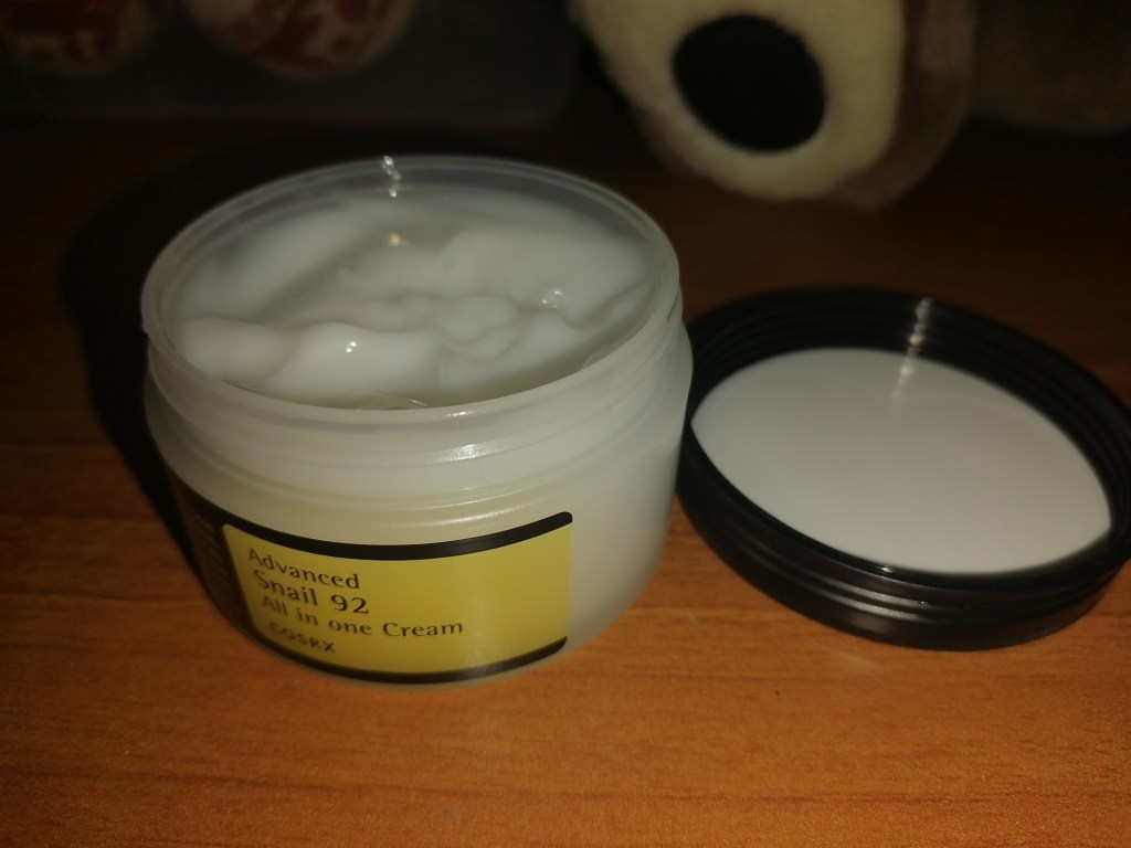 The cream is a mixture between a gel and a lotion, so it’s very liquidy and you only need a small amount. It is very sticky, just like snail mucin probably feels (I haven’t touched the stuff, so I don’t know), but it absorbs into the skin and it has a velvety finish.