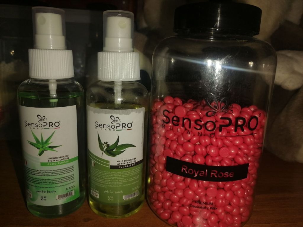 I got a bottle of wax beads with a very nauseating rose scent, but it was a mistake because I was supposed to receive bubblegum scented ones. Also, there is some body oil with aloe to use before applying the hot wax and some eucalyptus and olive body oil to use after the was is removed.