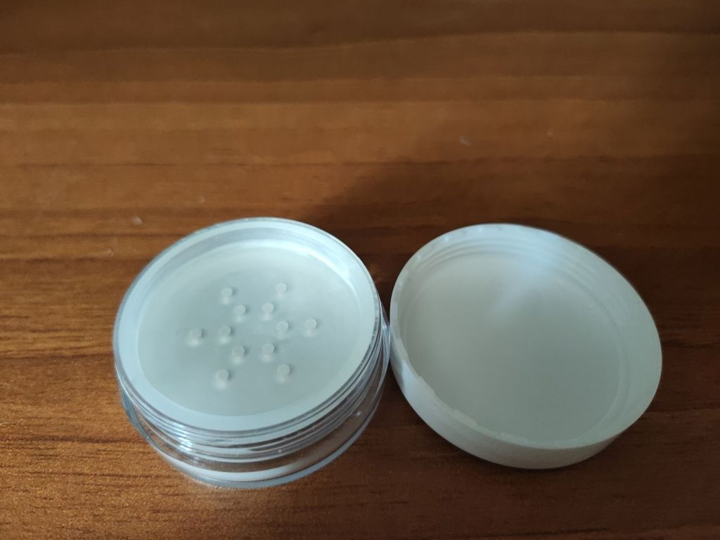 The powder comes in a plastic jar with a sifter. I have a deluxe sample size (5 grams), but the full size product contains 15 grams. The packaging is very basic, white, but the writing is holographic so it looks interesting but I know it will fade away fast.