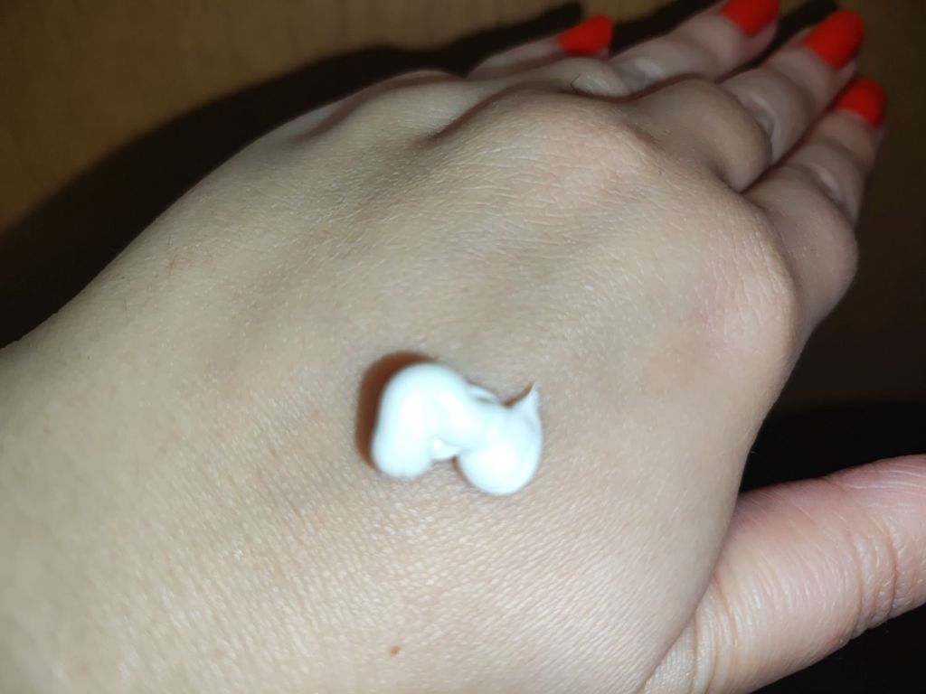 The cream has a thick texture and it can look intimidating at firs because it looks very white, but it melts into the skin and doesn’t leave a white cast. A “blob” like the one in the picture is enough for the entire face and neck area. The cream does have a scent and I can’t say that I like it, but fortunately it doesn’t linger on the skin so it doesn’t bother me. It’s not sticky and it doesn’t make the skin look shiny.
